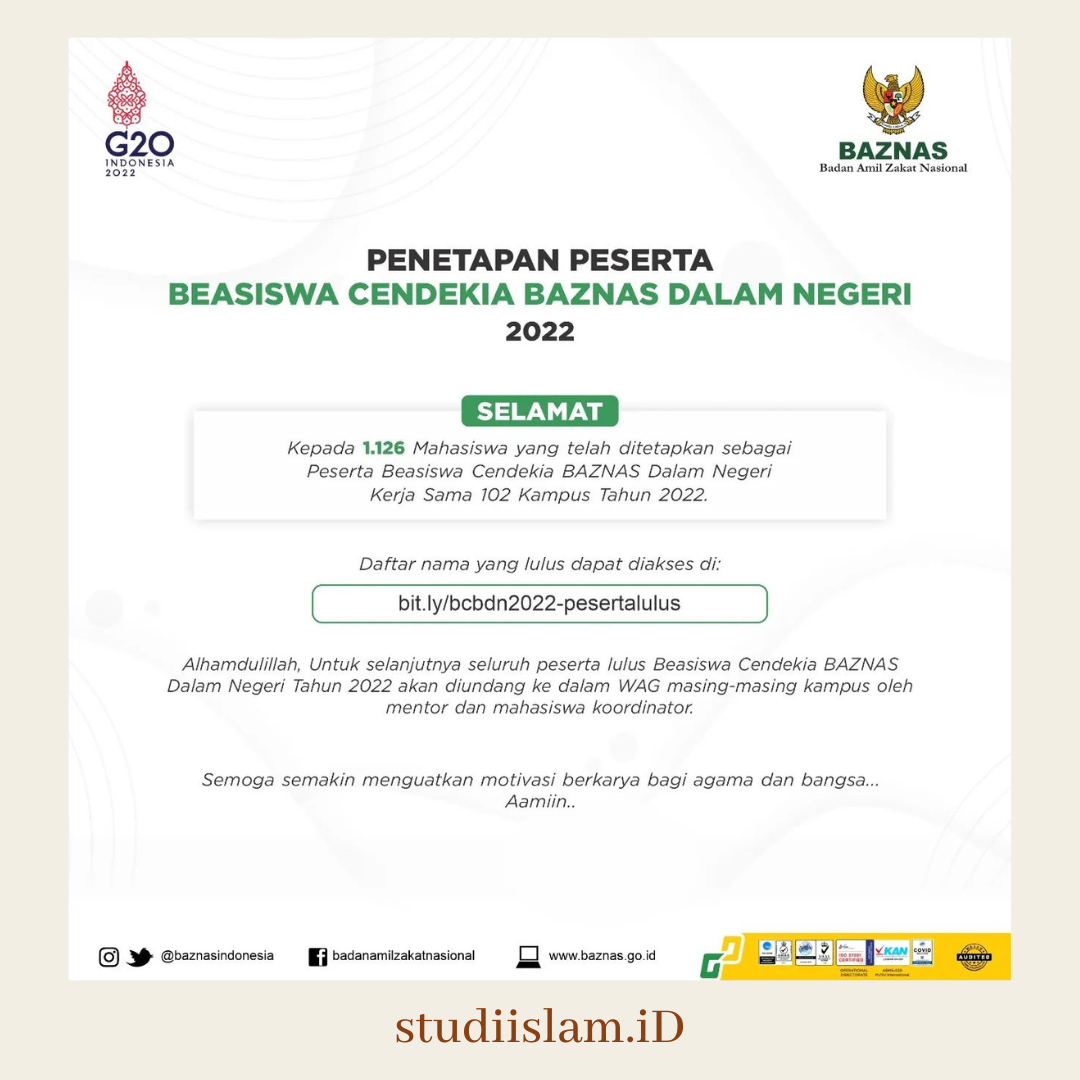 Alhamdulillah, Untuk selanjutnya seluruh peserta lulus Beasiswa Cendekia BAZNAS Dalam Negeri tahun 2022 akan diundang ke dalam WAG masing-masing kampus oleh mantor dan mahasiswa koordinator.